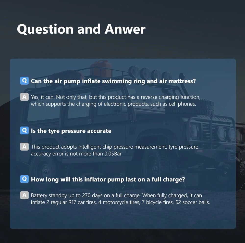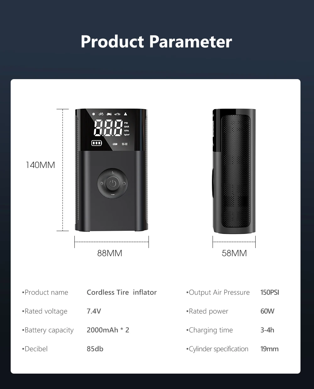 • High Pressure :With a maximum pressure of 150PSI, this air compressor can inflate tires quickly and efficiently.