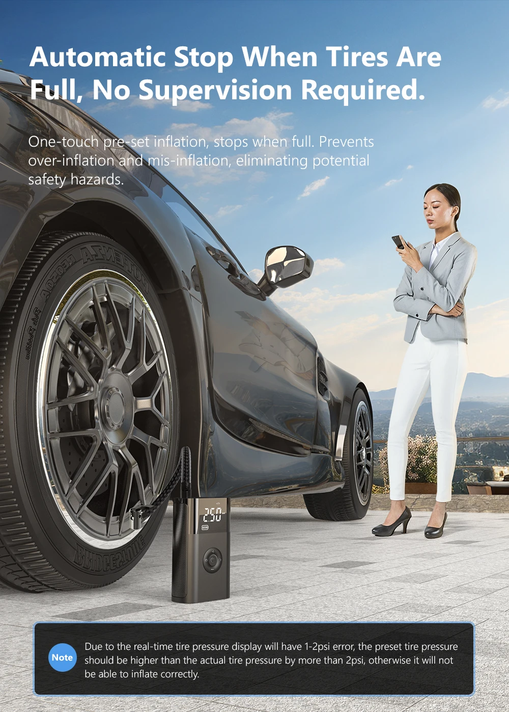 Note: Due to the real-time tire pressure display will have 1-2psi error, the preset tire pressureshould be higher than the actual tire pressure by more than 2psi, otherwise it will notbe able to inflate correctly.